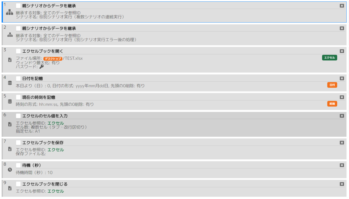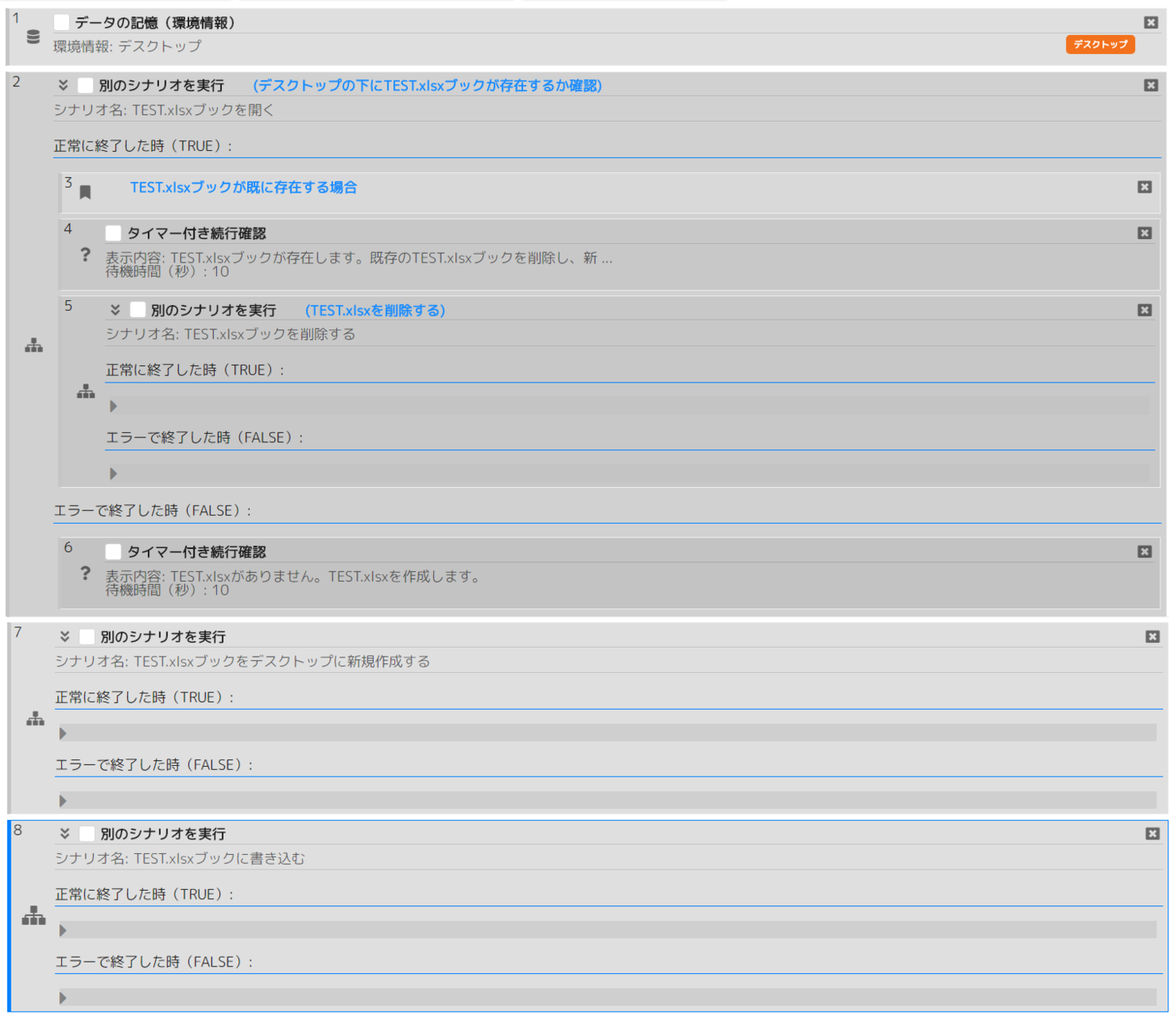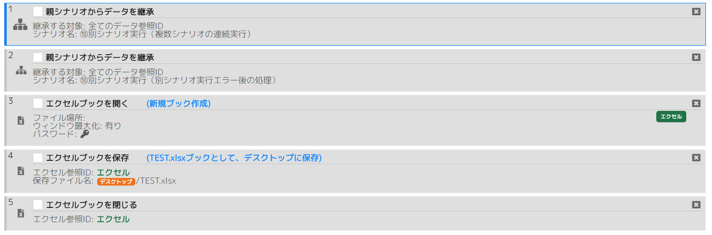 子シナリオ1を呼び出し実行します。子シナリオ1の中で、デスクトップに、TEST.xlsx ブックを新規に作