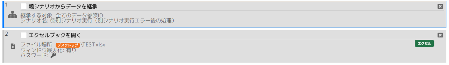 子シナリオ1を呼び出し実行します。子シナリオ1の中でデスクトップの TEST.xlsx ブックを開きます。