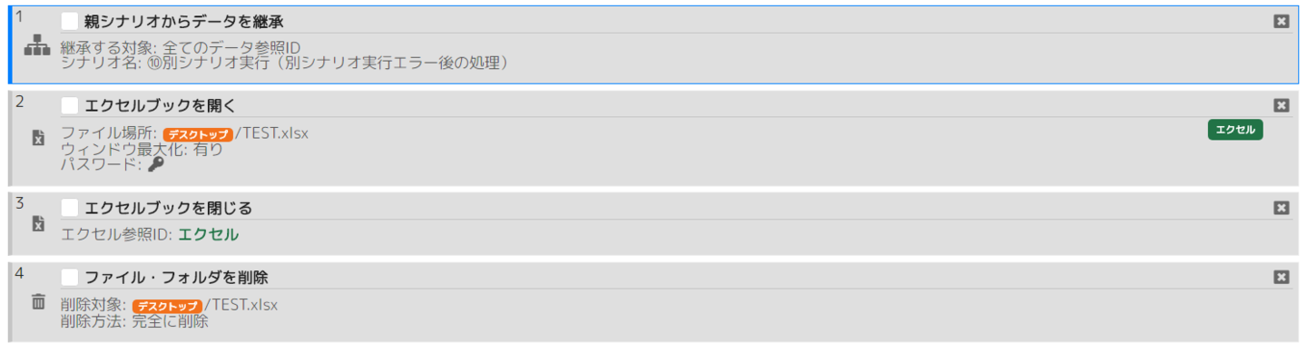 続けて、子シナリオ2を呼び出し実行します。子シナリオ2の中で、デスクトップに存在する TEST.xlsxブックを削除します。