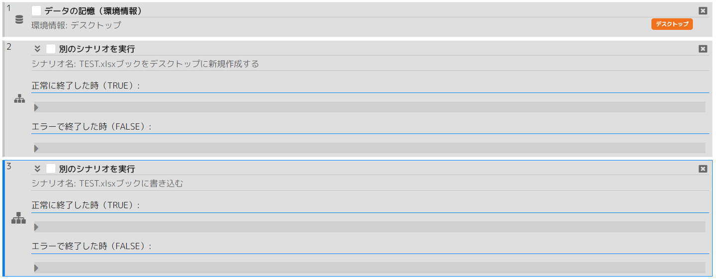 子シナリオ3を呼び出し実行します。子シナリオ3の中で、新たに、デスクトップに TEST.xlsx ブックを作成します。