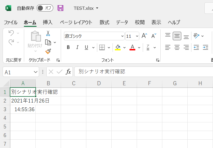 シナリオ実行時の日付・時刻を記憶し、TEST.xlsx の A1 セルに、「別シナリオ実行確認」の文字と、日付・時刻を入力します。